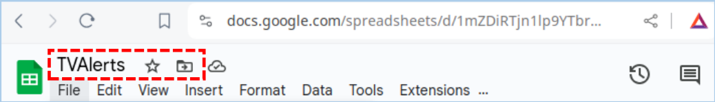 Click on the name field containing ‘Untitled spreadsheet’ found in the top-left corner of the window, then type a descriptive name, such as in this guide the Google Sheet is renamed to ‘TVAlerts’. Afterwards typing the new name either press the <enter> key, or click anywhere on the sheet to complete renaming the Google Sheet.